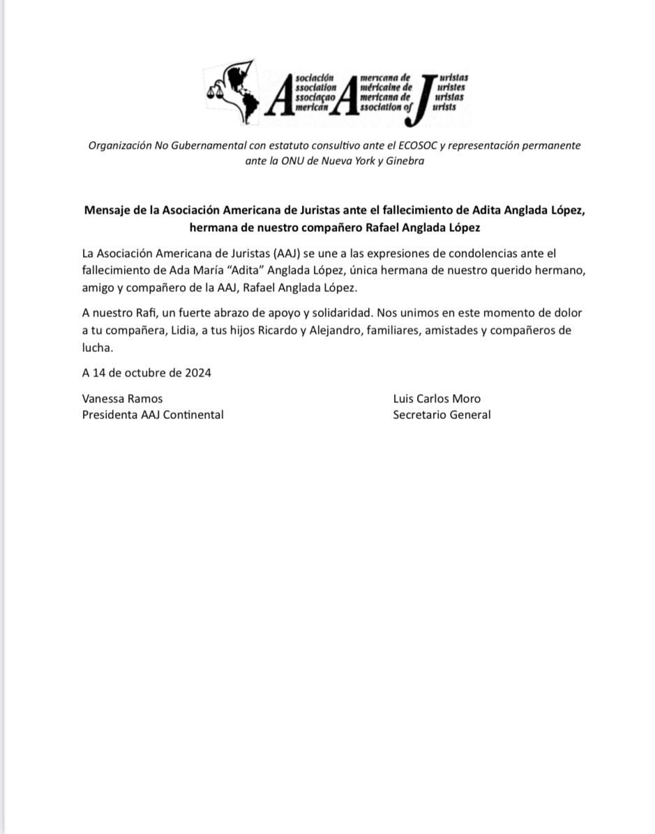 Portada » Condolencias ante el fallecimiento de Adita Anglada López. Acompañamos en su dolor a “Rafi”, familiares y allegadxs.Condolencias ante el fallecimiento de Adita Anglada López. Acompañamos en su dolor a «Rafi», familiares y allegadxs.por Asociacion Americana de Juristas18 de octubre de 2024
