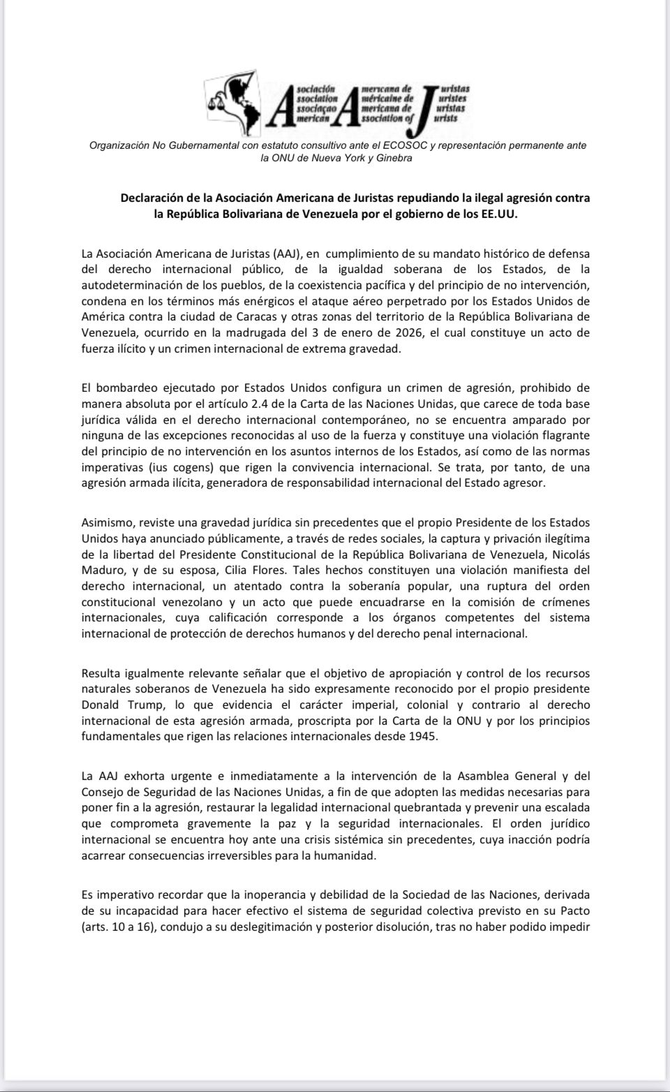 Portada » Declaración de la Asociación Americana de Juristas (AAJ) repudiando la ilegal agresión contra la República Bolivariana de Venezuela por el gobierno de los EE.UU. – Enero 2026