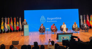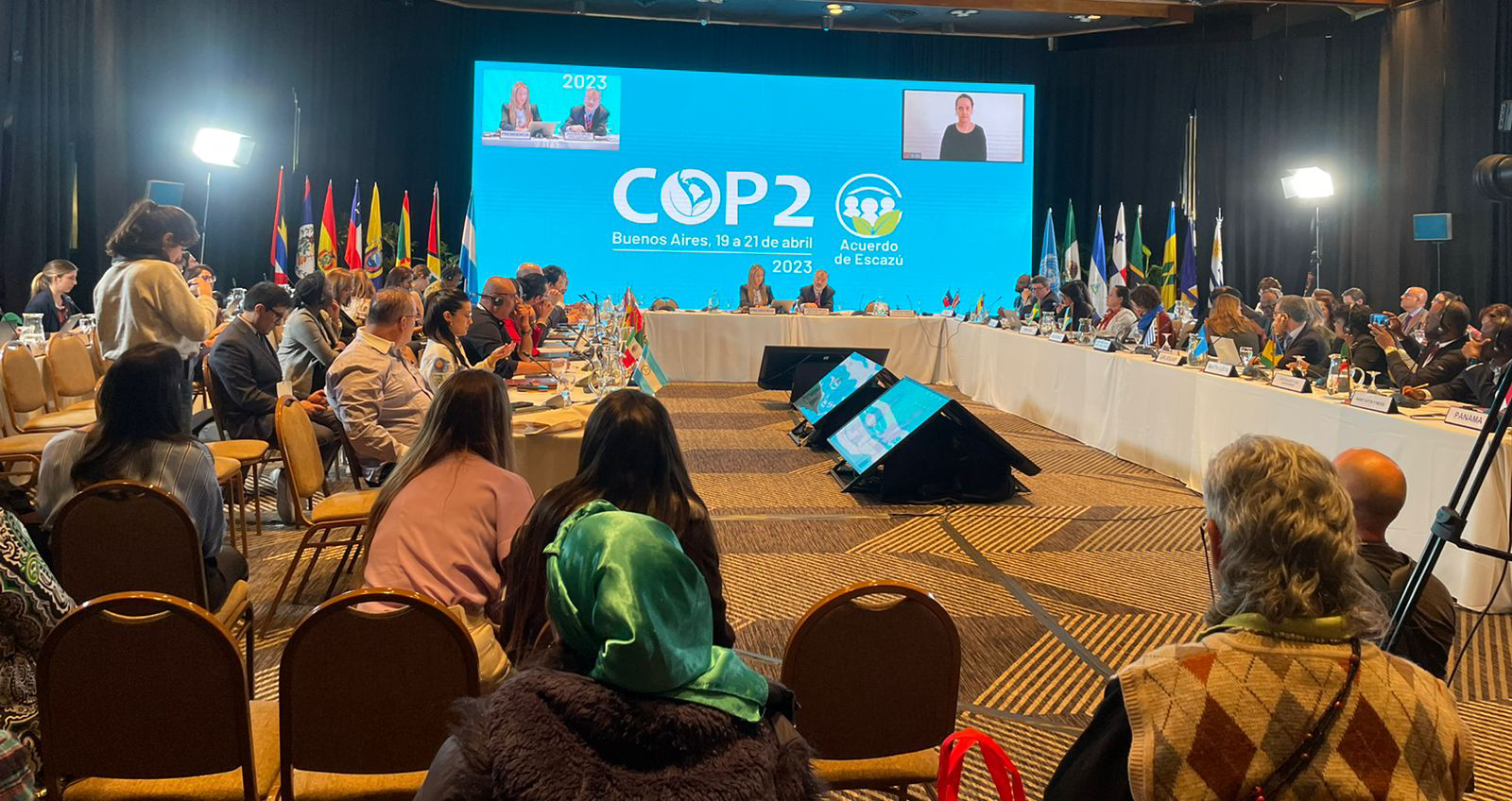Del 19 al 21 de abril 2023 se llevó a cabo en Buenos Aires, Argentina, la Conferencia de Partes Extraordinaria/COP2/Mecanismo de seguimiento del Acuerdo de Escazú, que tiene como propósito asegurar el cuidado del ambiente de América Latina y Caribe, la protección de los defensores ambientalistas y el acceso/ circulación de información ambiental a los efectos de que la sociedad civil conozca en la materia y pueda influir a sus gobiernos en temática ambiental.