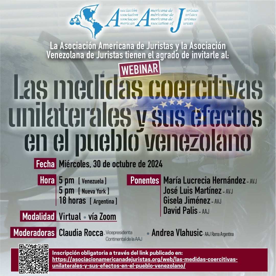 La Asociación Americana de Juristas (AAJ) y la Asociación Venezolana de Juristas (AVJ) tienen el agrado de invitarles al foro “Las medidas coercitivas unilaterales y sus efectos en el pueblo venezolano”.