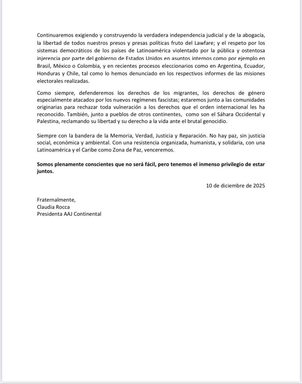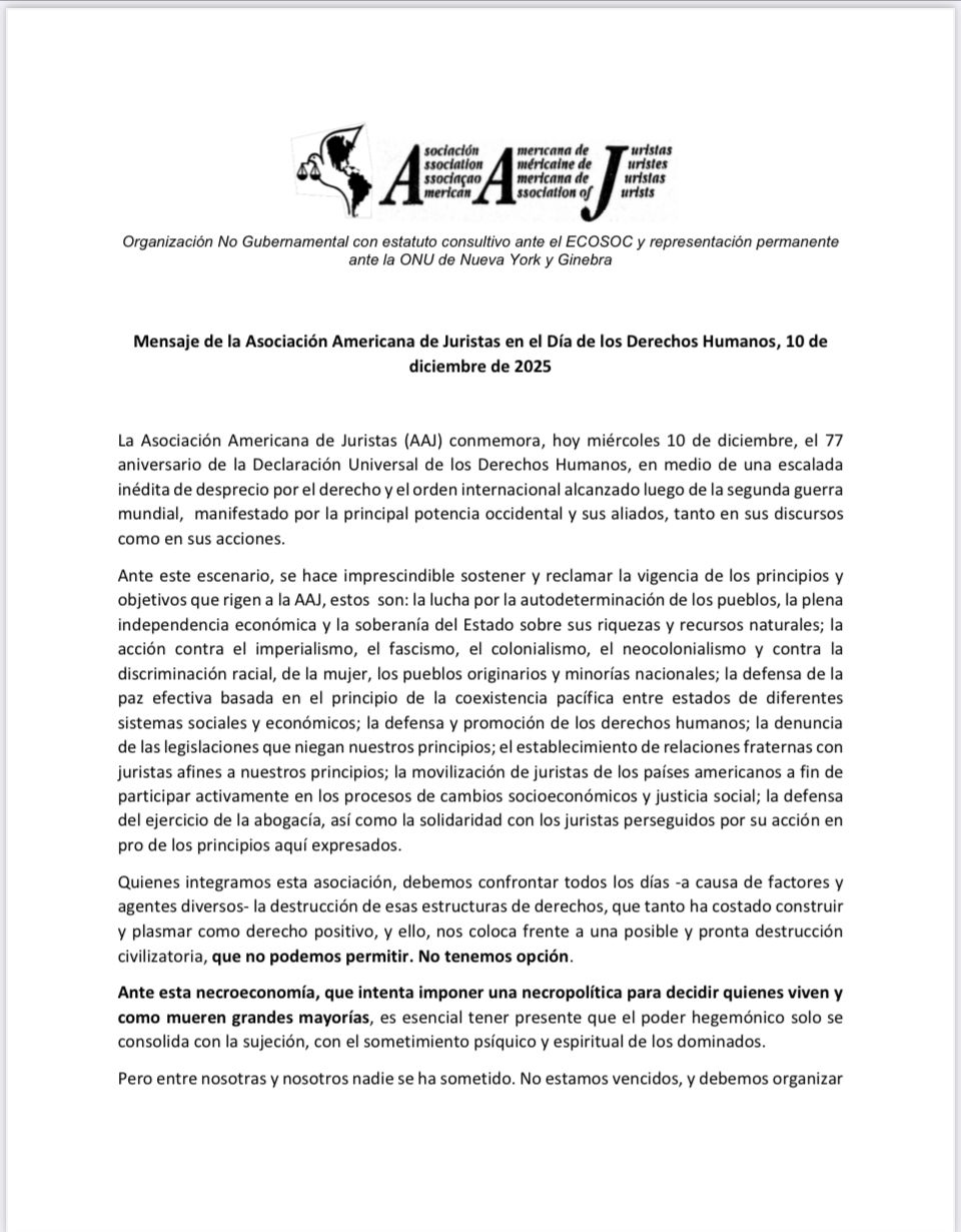 Portada » Mensaje de la Asociación Americana de Juristas en el Día de los Derechos Humanos – 10 de diciembre de 2025Mensaje de la Asociación Americana de Juristas en el Día de los Derechos Humanos – 10 de diciembre de 2025por Asociacion Americana de Juristas13 de diciembre de 202513 de diciembre de 2025 Mensaje en el dia los Derechos Humanos 10 de diciembre de 2025- final