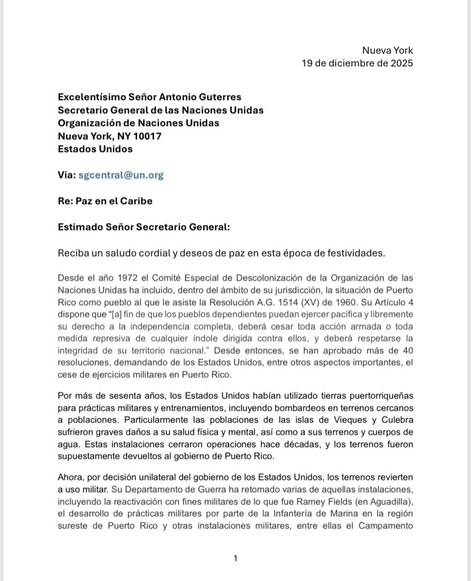 Portada » PAZ EN EL CARIBE. CARTA AL SECRETARIO GENERAL DE ONU. DICIEMBRE DE 2025.PAZ EN EL CARIBE. CARTA AL SECRETARIO GENERAL DE ONU. DICIEMBRE DE 2025.por Asociacion Americana de Juristas19 de diciembre de 202522 de diciembre de 2025*VERSIÓN PDF: Carta a Sec.Gral.ONU *IMÁGENES: