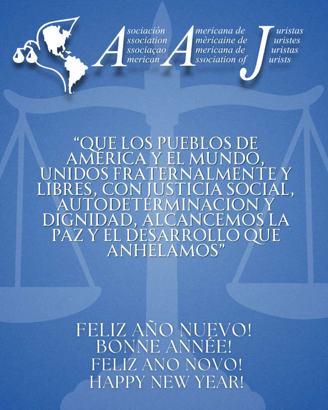 Portada » Saludo en las FiestasSaludo en las Fiestaspor Asociacion Americana de Juristas30 de diciembre de 20253 de enero de 2026 Que los pueblos de América y el mundo, unidos fraternalmente y libres, con justicia social, autodeterminación y dignidad, alcancemos la paz y el desarrollo que anhelamos. Les deseamos un muy feliz 2026! Dra. Claudia Rocca Presidenta Asociación Americana de Juristas (AAJ)